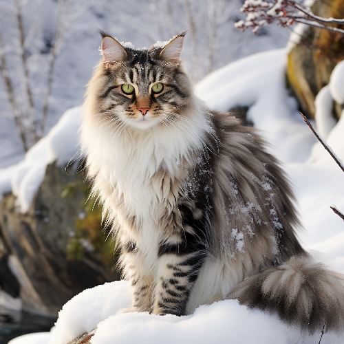 노르웨이 숲 고양이, 고장에서 "스콕칫"으로 불리며, 이 품종의 유전자에는 노르웨이 민속전설과 문화적 중요성이 녹아 있습니다. 바이킹과 함께 바다를 항해한 것으로 믿어지며, 이들 고양이는 노르웨이 신화에서 농잠하는 노르스 여신 프레이야의 반려동물로 숭배받았습니다. 그들의 긴 고급스러운 털, 끝이 손질된 귀와 더부룩한 꼬리는 그들이 자랑스럽게 부르는 서리 낀 북유럽 풍경을 연상시킵니다.